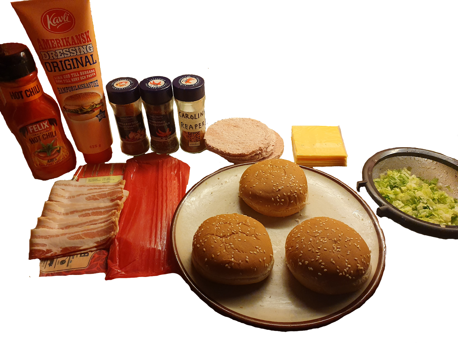 Ingredienser; ICA's frysta hamburgare, hamburgerbröd, ICA's hamburgerost, sallad, bacon, dressing, ketchup, kryddor...
